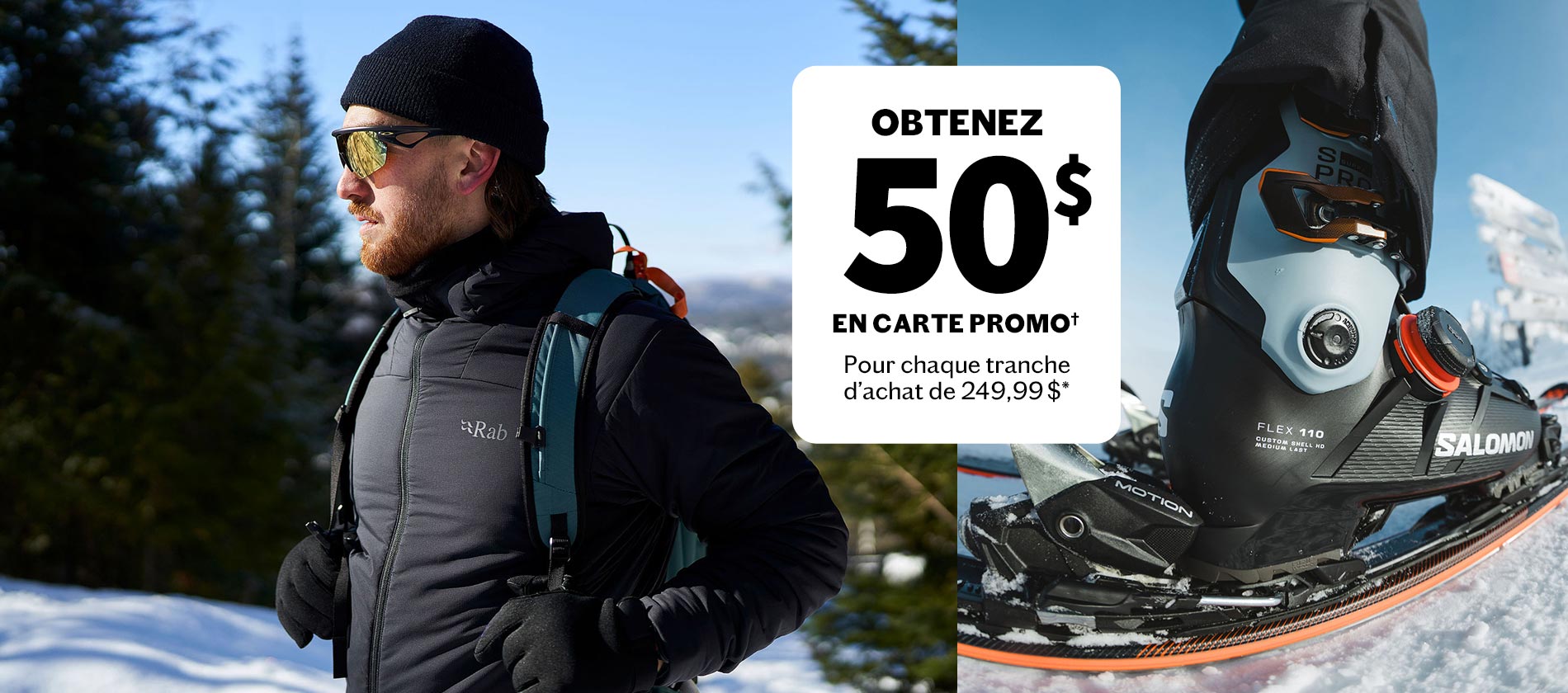 À l’achat d’équipement de ski et planche à neige sélectionnés, obtenez 50 $ en carte promo† pour chaque tranche d’achat de 249,99 $*.